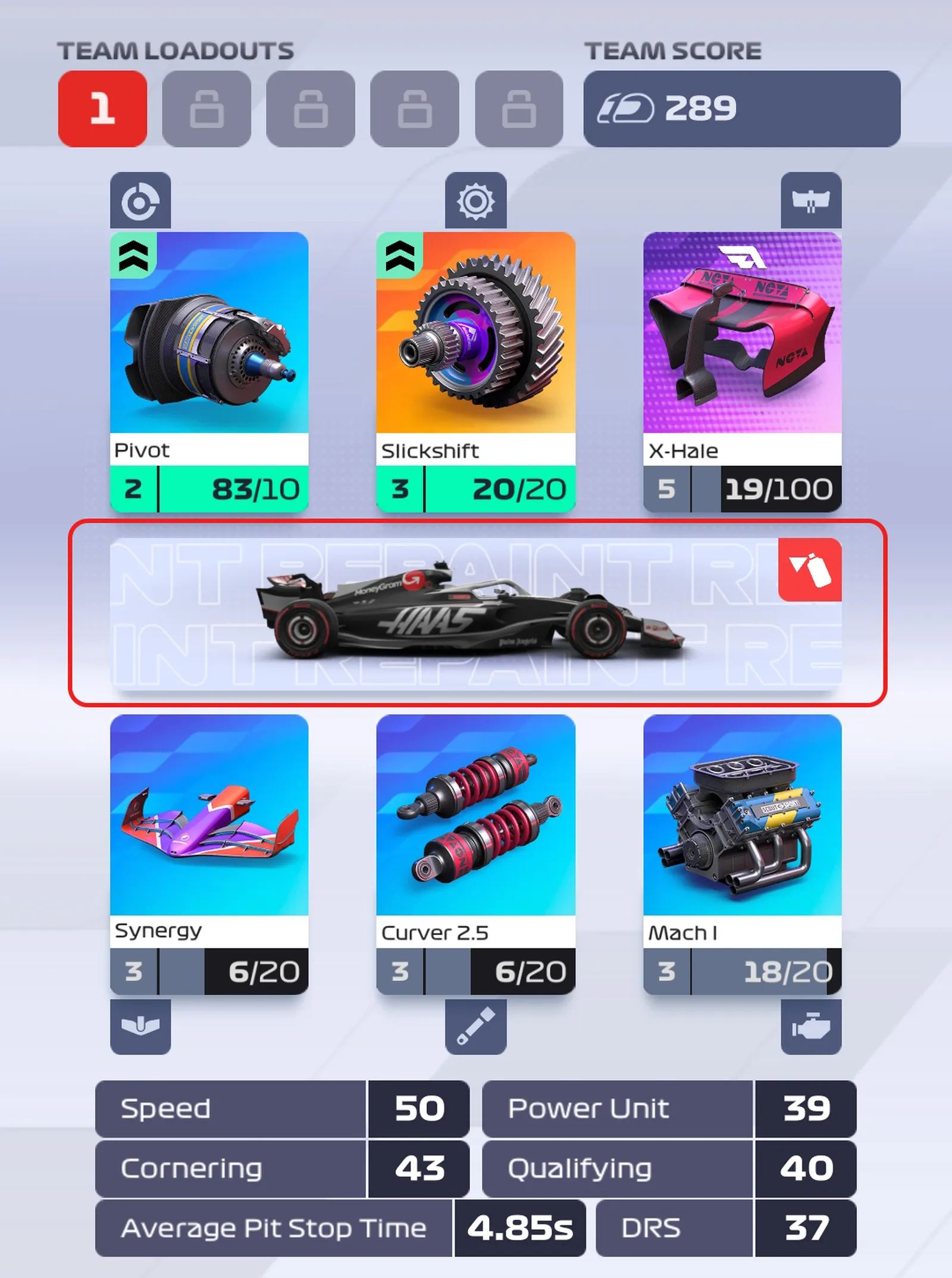 Components that provide the DRS mechanic will display their own DRS stat. The higher the stat, the faster DRS recharges and the longer it is activated on-track. Choose your Components carefully as the DRS function could outweigh the benefit provided in higher stats elsewhere. It's up to Players to determine which is more important.