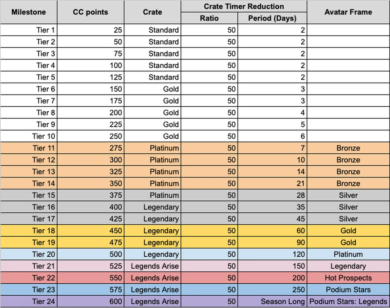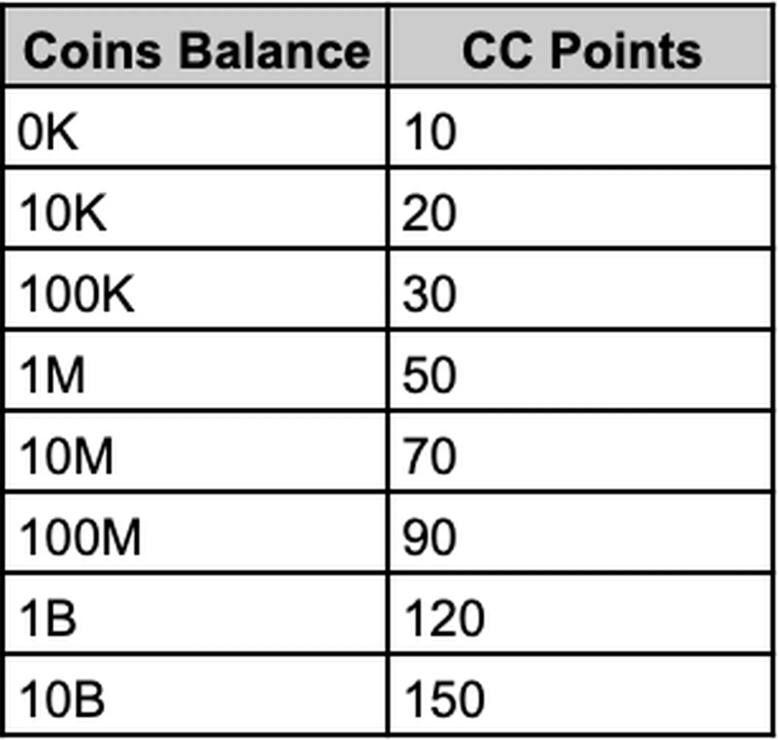 Additional to the Season Score progress rewards, a Player's Coin balance at the end of the 2025 Season will be converted into CC Points. The table below displays the required Coins needed for each tier of CC Points converted: