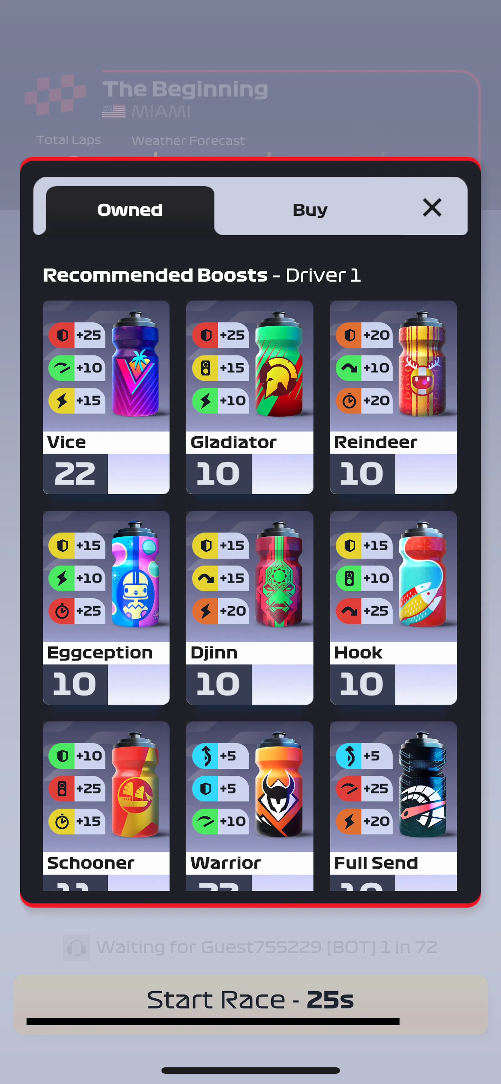 Recommended Boosts: Boost in your current inventory that are most recommended to enhance your performance for the specific circuit you are about to race on