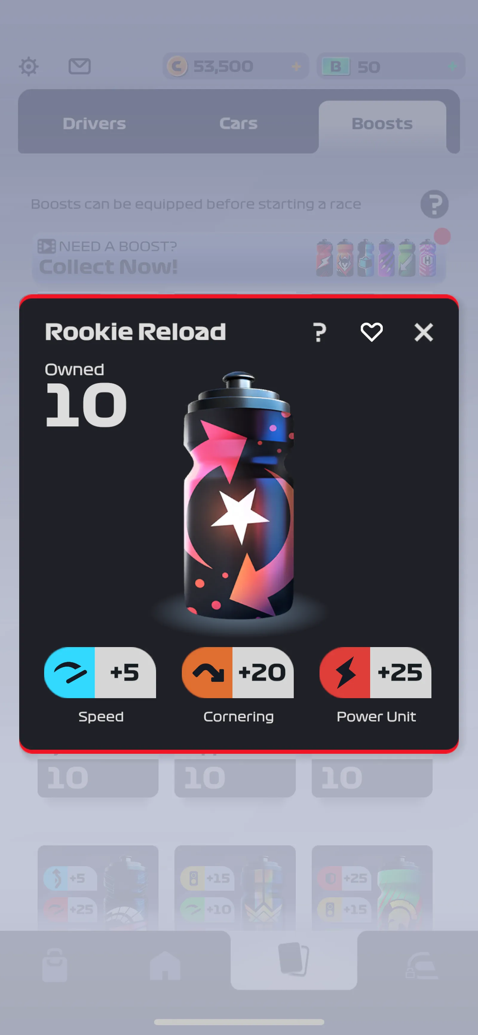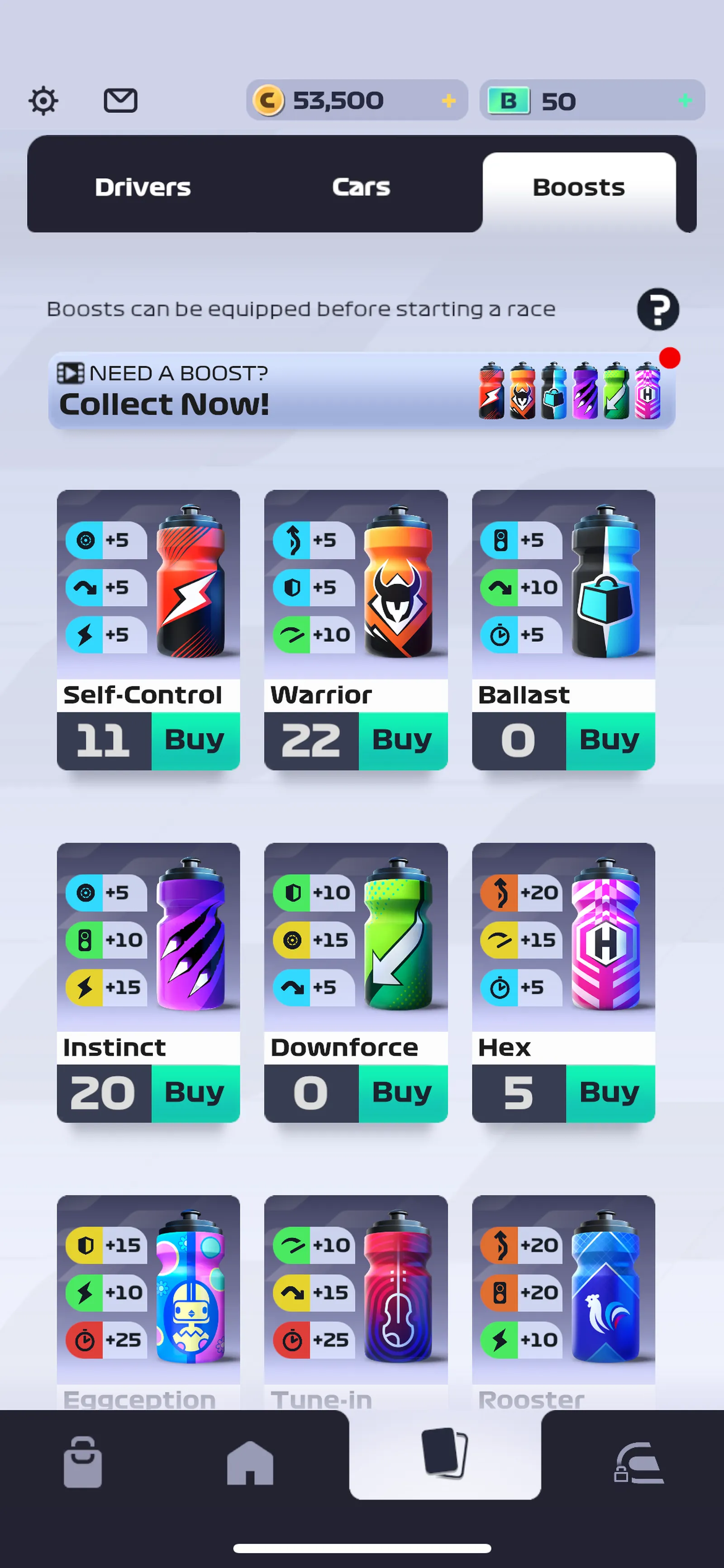 Boosts enhance your Driver and Component stats during the race. Each Boost is unique and will increase a number of specific stat areas.
