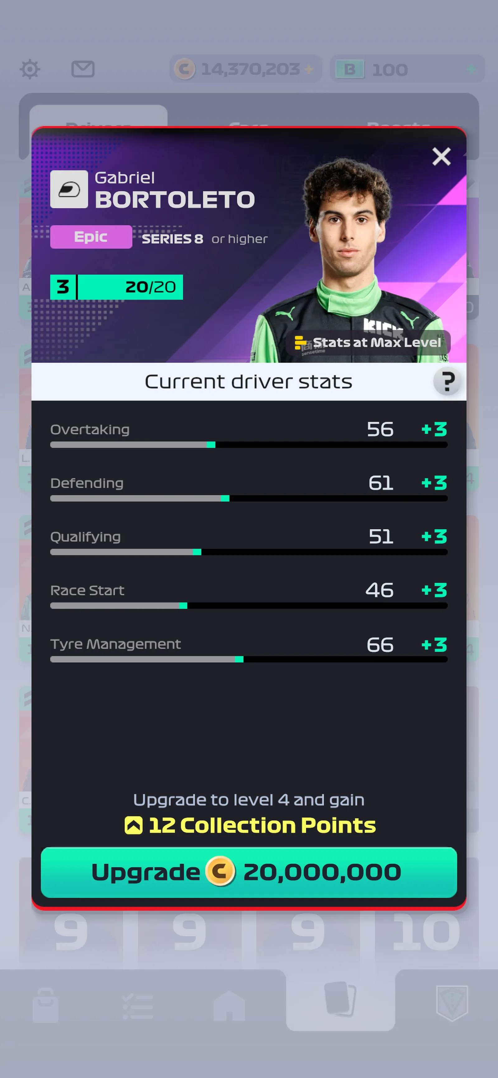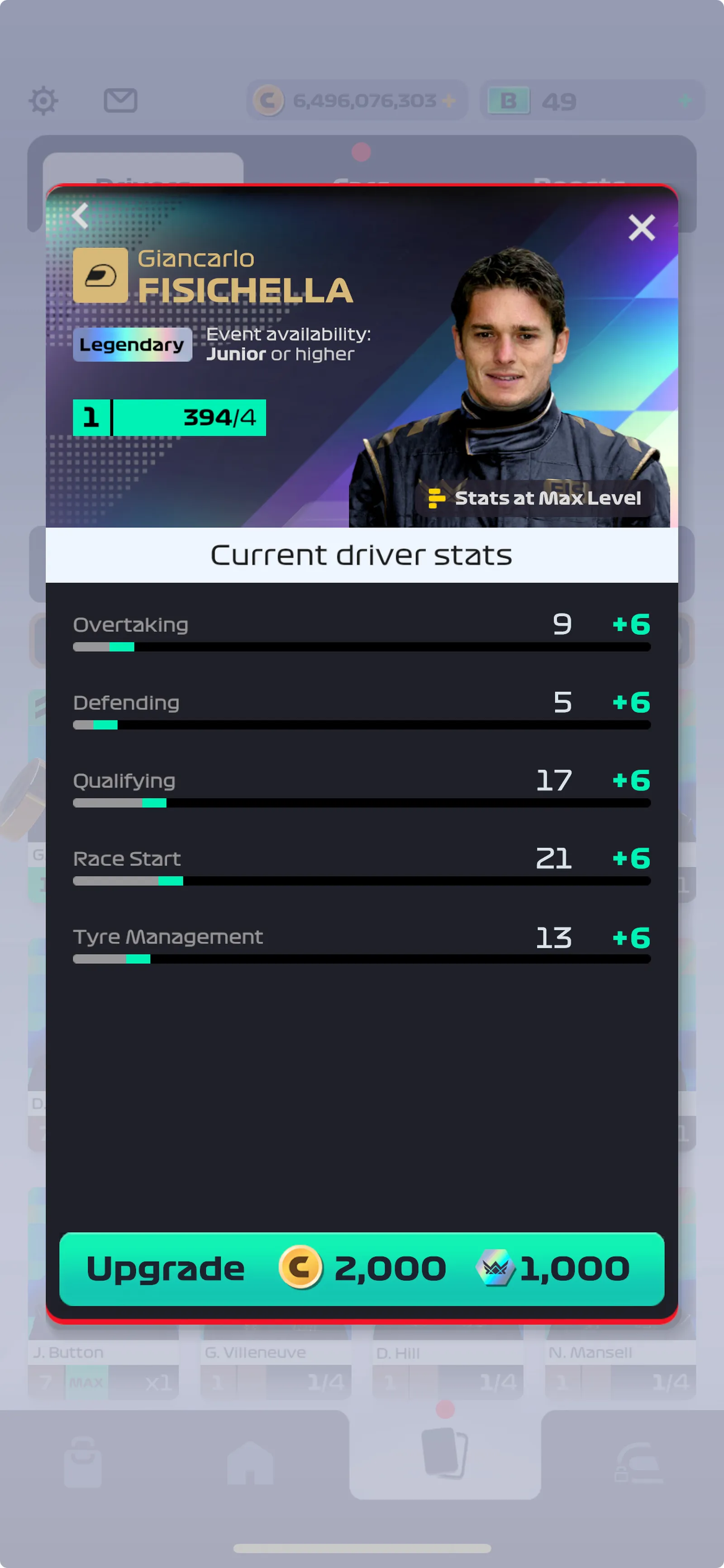Legendary Drivers and Special Editions are also upgradable. As with the other rarities, you will need a set amount of cards to be eligible to upgrade. Once obtained, upgrading to the next level requires a set Coins cost. Unlike other rarities however, Legendary Drivers and Special Editions also require a set Legacy Points cost to upgrade.