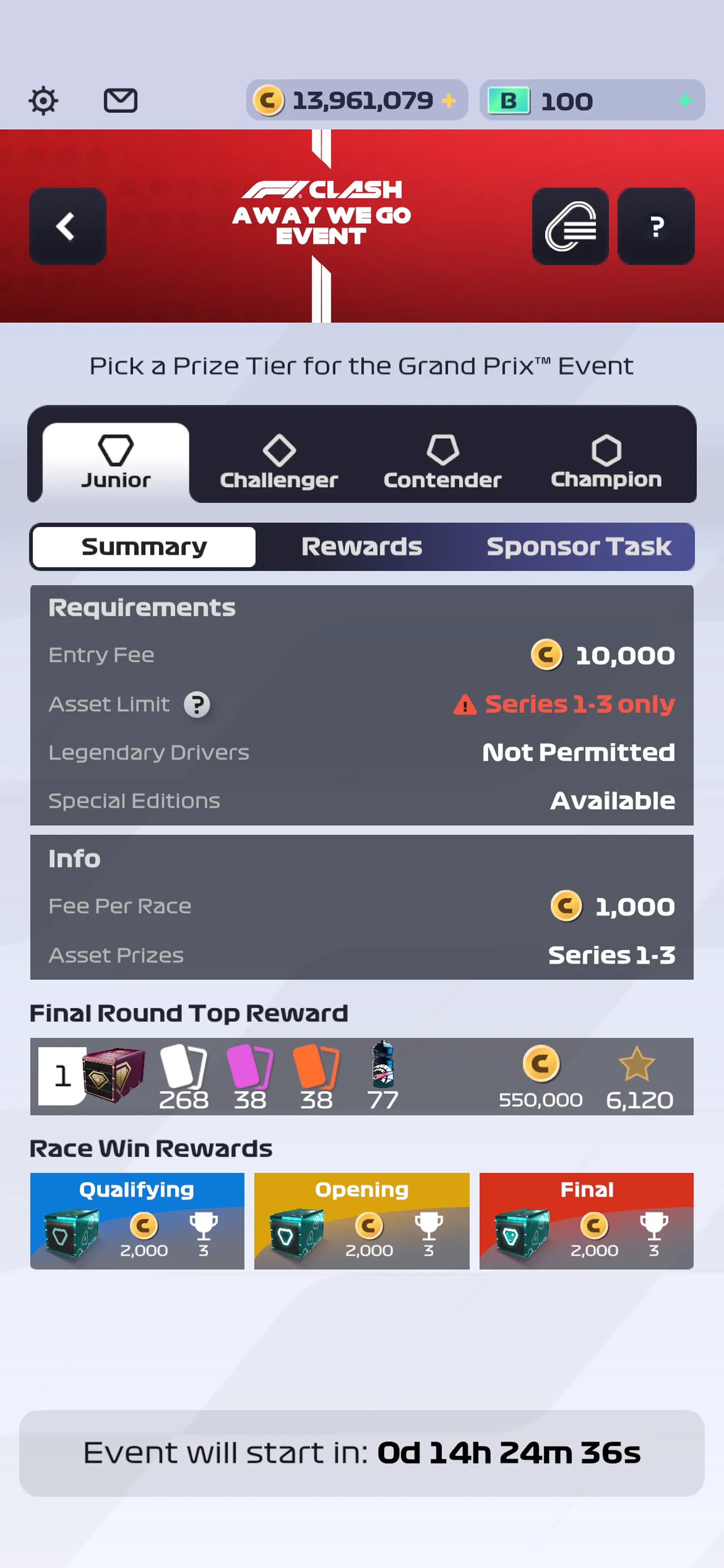 The Sponsor Task for the Event can differ depending on the difficulty tier you enter as well as for each round of the Event. The Sponsored assets can also have requirements tied to them, such as rarities or upgrade levels. Make sure to check these before starting your race!