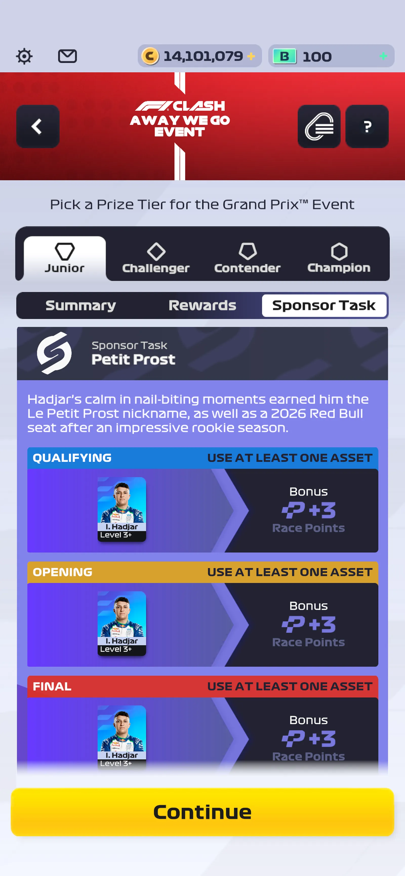 Tip: The required assets in these Sponsor Tasks may not always align with the Track Stats of each race or that of the Featured Assets. It’s up to you to determine whether the stat boost or Sponsor Task rewards are your priority!