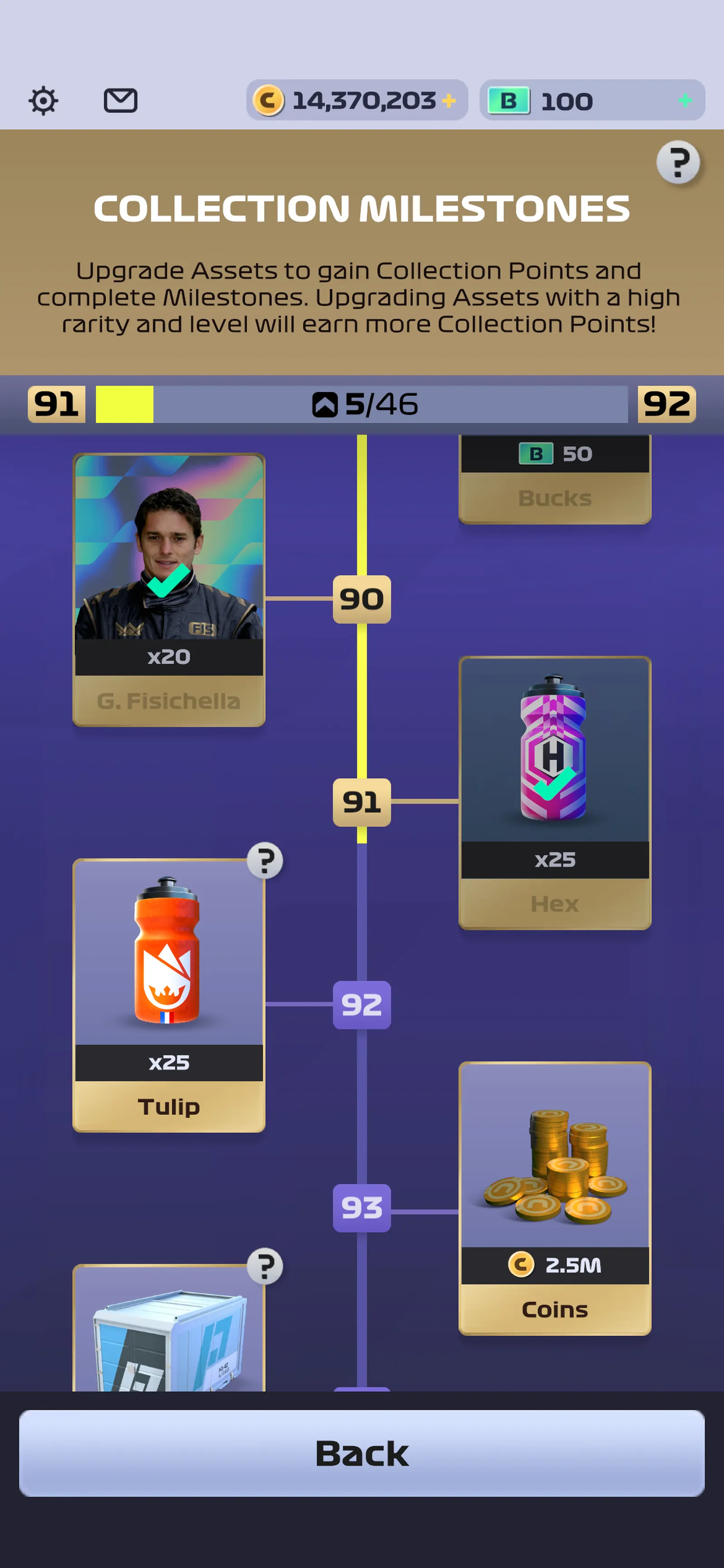 To make progress towards Collection Milestones, earn Collection Points. Collection Points are earned by upgrading your Drivers and Components. The Collection Points you earn for upgrading will differ depending on the Driver’s or Component’s rarity and unlock series, as well as the level of the upgrade.