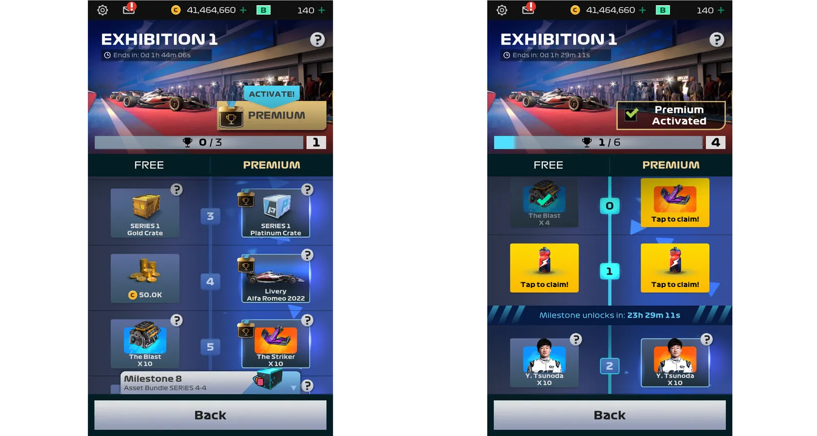 Rewards on the Premium Pit Pass are locked by default and can only be claimed after activating the Premium Pit Pass via an in-app purchase. You can upgrade to Premium at any point when a Pit Pass is active, and claim all the rewards that you reached up to your current milestone!