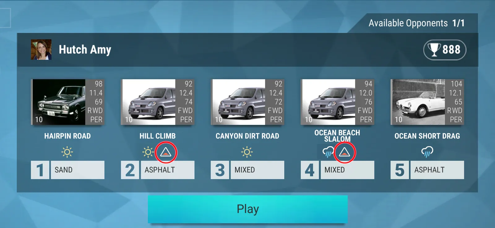 Q: The hill climb icons on rounds are a step in the right direction. Will we eventually see a percentage breakdown on surfaces. i.e. Rallycross Medium. Dirt 40%, Asphalt 60%. (Taz)